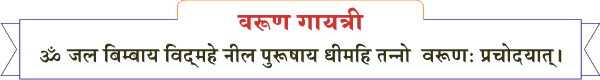 | ॐ जल बिम्बाय विद्महे नील पुरूषाय धीमहि तन्नो वरूणः प्रचोदयात्। |